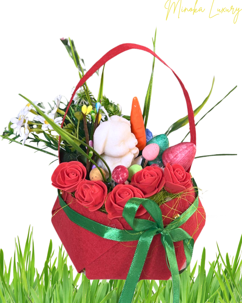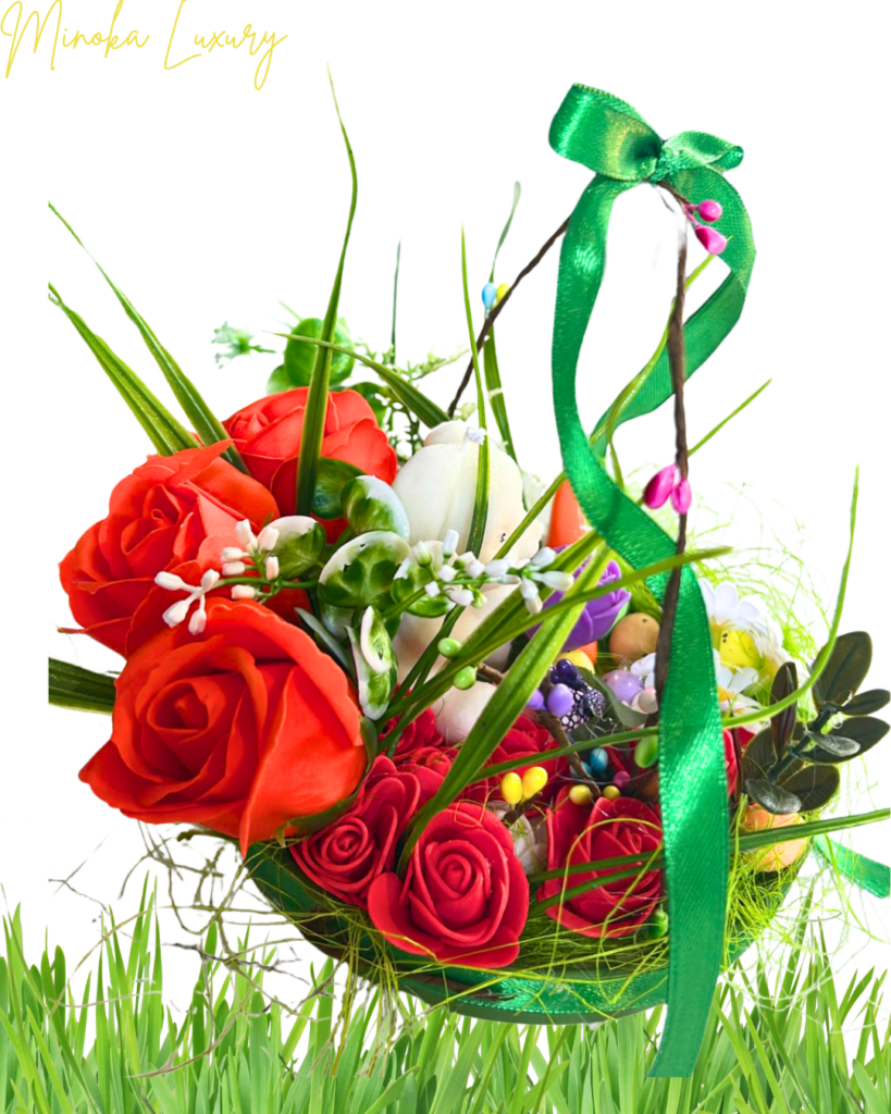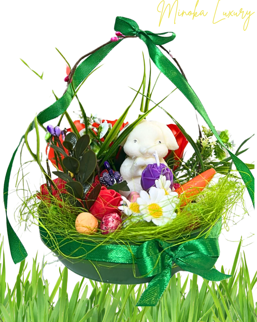 Coșuleț de Paște cu iepuraș din ceară parfumată și trandafiri din săpun – ediție specială Posted on 14/04/2025 by Minoka Luxury